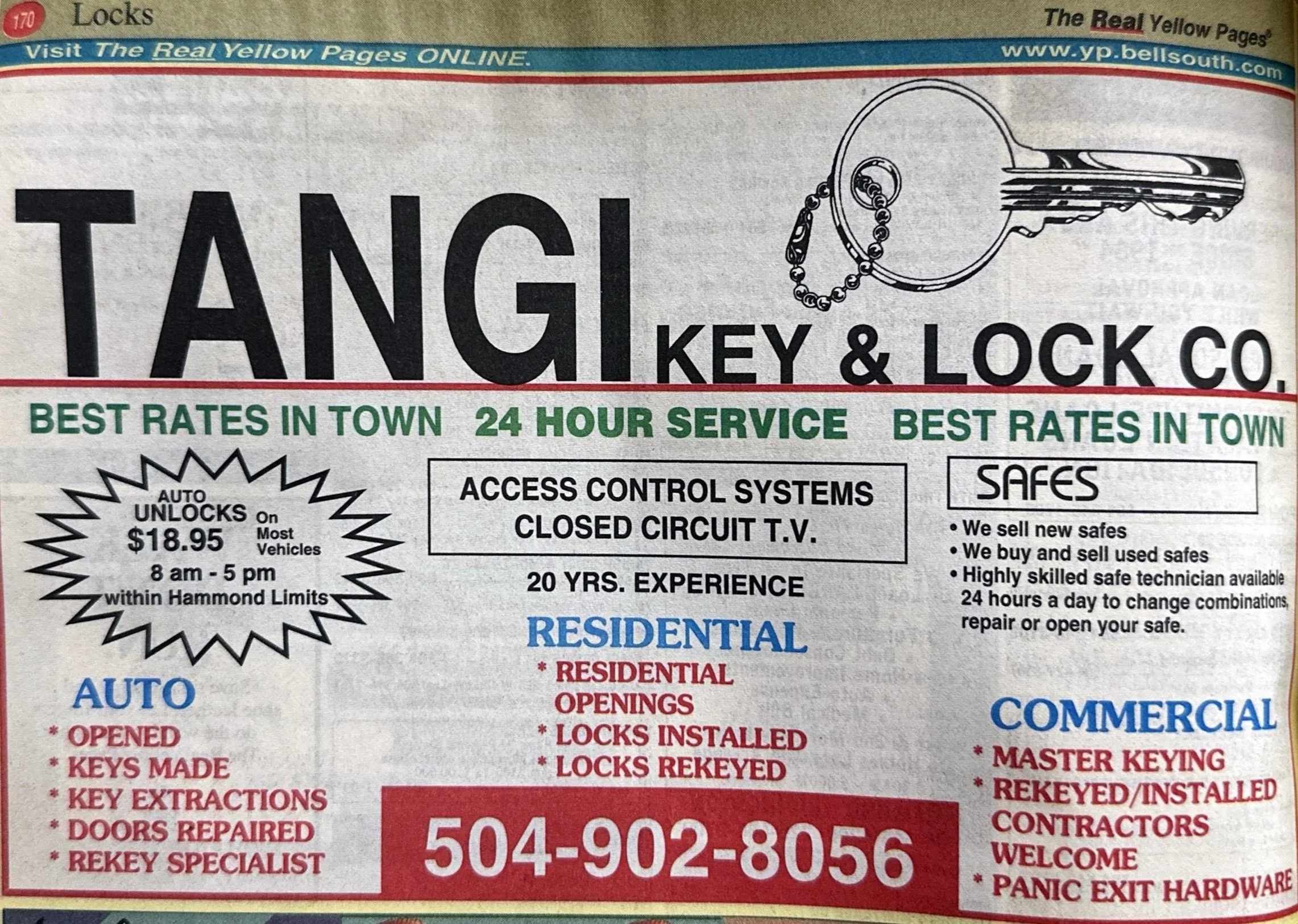 In 2001 he partnered with Jim of Cherokee Lock Works off of W. Thomas in Hammond. He would later buy out Cherokee Lock and fully re-brand it into what is now known as Tangi Key & Lock Co. He stayed in the W. Thomas location until around 2005 when Hurricane Katrina hit. In the following weeks he would start construction of the strip mall located on N. Morrison Blvd across from the Roger’s Ready Mix.
